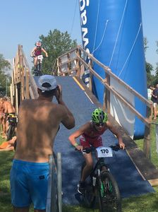 Danach waren die Größeren dran. Lydia und Marleen mussten eine Schwimmstrecke von 100m zurücklegen, danach einen MTB-Kurs mit Trail von 7km Länge und am Schluss noch 1,5km Crosslauf bewältigen.