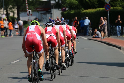 10:45 Uhr erklang dann die Start-Tröte für die Männer. Es mussten 750 m geschwommen, 20 km geradelt und 5 km gelaufen werden. Das Schwimmen wurde im Freibad auf einer 50 m Bahn absolviert. Jedes Team startete für sich, das heißt nach jeweils einer Minute erfolgte der Start des nächsten Teams. Die Reihenfolge der Starts setzte sich nach der Gesamtplatzierung der vergangenen Saison zusammen. Unsere Männer hatten sich im Schwimmen super platziert und konnten bereits nach 11:20 min den Wechselgarten verlassen und gemeinsam auf das Rad springen. Erst auf der Radstrecke konnte ein Starter ‚verloren‘ gehen, falls ein Defekt am Rad oder dann doch die Müdigkeit einsetzte. Gleiches galt natürlich auch für die Frauen.