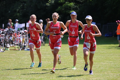 Diesen Zusammenhalt hat man auch bei den Frauen direkt ab dem Beginn sehen können. Das Schwimmen lief gut. Auch wenn taktische Maßnahmen spontan vor dem Start umgestellt wurden, behielt unsere Schwimmerin Lea die ganze Zeit den Überblick und zog uns durchs Wasser, sodass wir nach 12:21 min auf unser Fahrrad springen konnten. Auch beim Radfahren übernahm sie das Kommando und brachte uns zum kreiseln. Mit 31:30 min konnten wir uns eine solide Radzeit erfahren und mussten jetzt beim Laufen alles geben. Der Kurs war teilweise ziemlich wechselhaft, da es schnelle Richtungswechsel und viele Kurven gab. Aber wir ließen uns nicht beirren und versuchten uns untereinander durch Zurufe und gegenseitiges Schieben zu motivieren. Die zweite Runde wurde dann nochmal hart, aber als wir merkten, dass wir eins der Verfolgerteams etwas abschütteln konnten, gingen die letzten 1,5 km gleich viel leichter. Pauline kämpfte uns mit einem letzten Schub Ziel und sicherte uns wichtige Sekunden. Mit einer Endzeit von 1:04:37 konnten wir uns ebenfalls den 2. Platz in der Teamwertung ergattern und sind mehr als stolz. Wir gratulieren den anderen starken Frauen- und Herrenteams zu den starken Leistungen und freuen uns auf die weitere Saison!