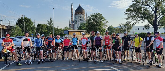 Am Samstag den 4. Juni trafen wir uns nun am frühen Nachmittag am Parkplatz am Steyer-Stadion. Bereits im Vorfeld hatten mich einige Nachrichten und Rückfragen erreicht, so dass ich sehr optimistisch ob der Beteiligung und damit einhergehenden Windschattens war. Am Treff wurde es auch schnell voll. Insgesamt 32 Sportfreunde aus Cottbus, Erfurt, Ulm, Plauen, Leipzig und der Dresdner Region hatten sich eingefunden. Nach kurzer Begrüßung und Einweisung rollten wir los, der B6 Richtung Meißen folgend. Wie eine langer Fahrradwurm schlängelten wir uns aus dem Stadtgebiet. Alsbald ging es links den Elbhang hoch Richtung Röhrsdorf, Naustadt und Reichenbach. Nach dem ersten Anstieg teilten wir die Gruppe. Die erste Gruppe führten Caro, Björn und Robert an, während Vizepräsident Bruno, Stephan und ich uns liebevoll um die zweite Gruppe kümmerten. Wir düsten entlang von bunten Mohnblumen eingerahmten Getreidefelder. Einem fast schon alpin anmutenden Serpentinchen folgenden fuhren wir in Meißen ein.