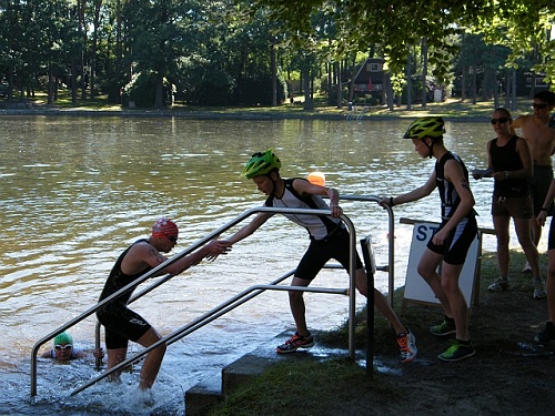 2 Jungen/ 1 Mädchen + 2 Mädchen /1 Junge – absolvierten jetzt die Hatz im A-B-C- System – immer in der Reihenfolge Schwimmen – Rad – Lauf. Vorsichtshalber hatten sich die Sportler ihre Reihenfolge auf den Handrücken geschrieben. Kommentar von außen: „...siehst du durch?...“; „...nee, aber die müssen's ja wissen!...“ Das völlige Durcheinander hat System! Schon nach dem 1. Durchgang waren die Leipziger vorn und bauten kontinuierlich die Führung aus. 2. war Klingenthal, 3. Riesa und knapp dahinter der Regionalsieger aus Dippoldiswalde/ Altenberg, die sich allerdings Einiges vorgenommen hatten.
