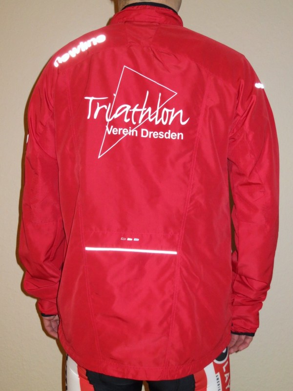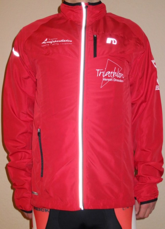 Die Jacke (Newline Base Race Jacket) kommt in der TV-Dresden Farben rot und weiß. Sie bietet sehr guten Schutz vor Wind, optimale Wasserdichtigkeit und sehr gute Atmungsaktivität. Sie ist mit vielen Reflektoren ausgestattet und für die kühleren Tage (Run + Bike) perfekt geeignet. Eine Seitentasche sowie eine MP3-Tasche (Kabelausgang nach innen) bieten optimalen Stauraum. Der Preis beträgt 49,50 EUR.