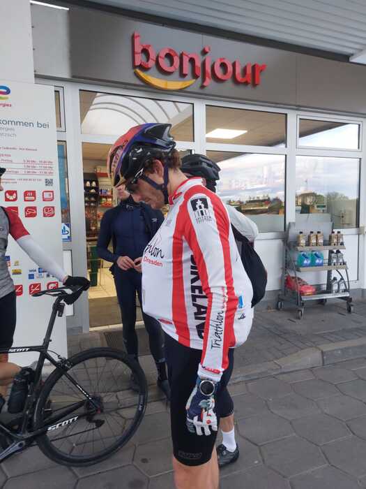 Der starke Wind hing den Fahrern im Rücken und es folgte eine letzte dritte längere Teiletappe. Das Snickers-Angebot hatte den Teilnehmern bei Total total gut gefallen und so wurde der letzte Tankstellenstop bei Total in Lommatzsch angepeilt. Nach und nach wurde es etwas ruhiger im Feld, jeder hatte mehr und mehr mit sich zu kämpfen, die einen mehr, die anderen weniger. Glücklicherweise nahm, je später es wurde, der Rückenwind nur leicht ab und so flog das Tête de la course um 17:03Uhr nach 254 km bei Total ein. Scheinbar gehen die Uhren in Lommatzsch etwas nach, denn es war schon 3 min nach Schließzeit und die Teilnehmer wurden noch vollumfänglich versorgt. Zur Not hätte noch der Dönermann um die Ecke ausgeholfen, Hauptsache Energie. Nach einer fabulösen Betankungszeit von gerade einmal 13 min bagnn das Feld 17:16Uhr mit einem leichten grinsen wieder die Fahrt für die Schlussetappe nach Dresden aufzunehmen. Nun konnte genossen werden. Um 17:45Uhr meldete sich über den Tourfunk der Verfolger, das Feld solle in Lommatzsch nicht auf ihn warten, ihm gehe es überragend und er rausche gleich durch. Aufgrund der ganzen Täler war der Empfang schlecht, er war ahnungslos und wusste nicht, dass das Tête de la course schon wieder on tour ist. Nach 294 km rollte das 12 Mann starke Feld !pannenfrei! (knapp 4000 km in Summe) 18:40Uhr und damit deutlich unter 12 h auf den Neumarkt in Dresden. Eine halbe Stunde später erreichte bereits der Verfolger gesund und noch munter das Ziel. Damit haben alle Teilnehmenden den Sachsen3er erfolgreich ohne größere Vorkommnisse abgeschlossen und das Organisationsbüro war glücklich und erleichtert.