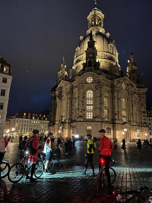 In der Nacht des 22.Oktobers um 01:51Uhr gab das Organisationsbüro kurzfristig bekannt, den Start aufgrund des prognostizierten Regens um eine halbe Stunde auf 07:00Uhr nach hinten zu verschieben. Später zeichnete sich ab, dass es bis etwa 07:30Uhr regnen würde und so stellten einige Teilnehmer Anträge die Startzeit noch ein weiteres Mal um eine halbe Stunde zu verschieben. Das Organisationsbüro lehnte ab. Geplant waren 10 h Fahrzeit mit insgesamt 2 h Pause, die Fahrzeit im Dunkeln sollte auf ein Minimum reduziert werden. Letztendlich trafen sich 13 Radfahrer unterschiedlichen Alters und Fitnesslevels, aber gleichen Geschlechts gegen 07:00Uhr an der Dresdner Frauenkirche.
