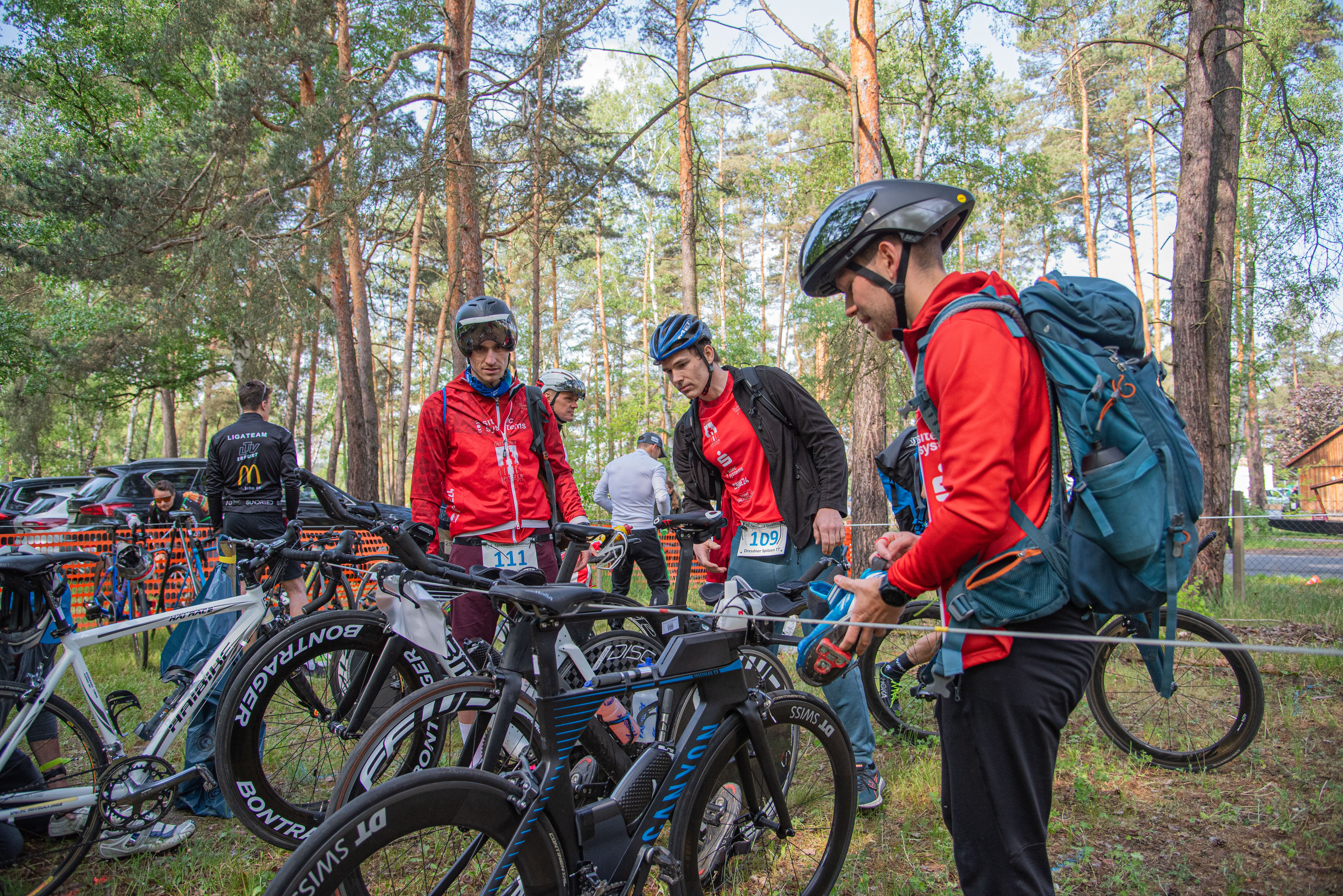 Nach den 10km Laufen ging es dann aufs Rad. Auf der Radstrecke gab es Windschattenverbot, sodass wir mit den Zeitfahrrädern über die Landstraße düsen konnten. Die Radstrecke war nahezu flach, mit nur wenigen leichten Anstiegen. Auf der Hälfte der Radstrecke ging mir leider mein Trinkhalm verloren, sodass ich für den Rest der Radstrecke auf dem Trockenen saß. Das tat meiner Verpflegung nicht gut. Nach einer großen Runde durch Wälder und kleine Dörfer war die Wechselzone wieder erreicht.