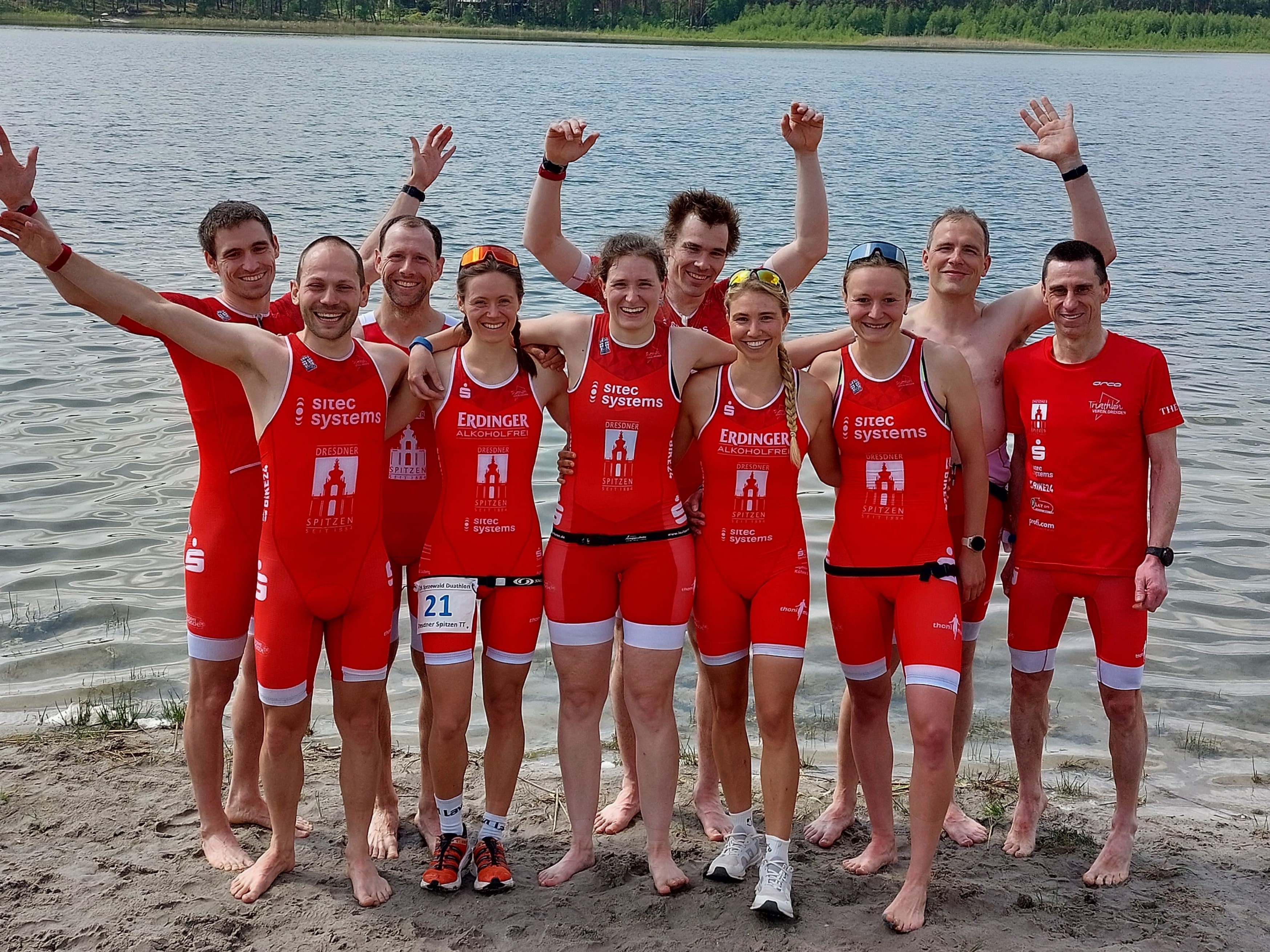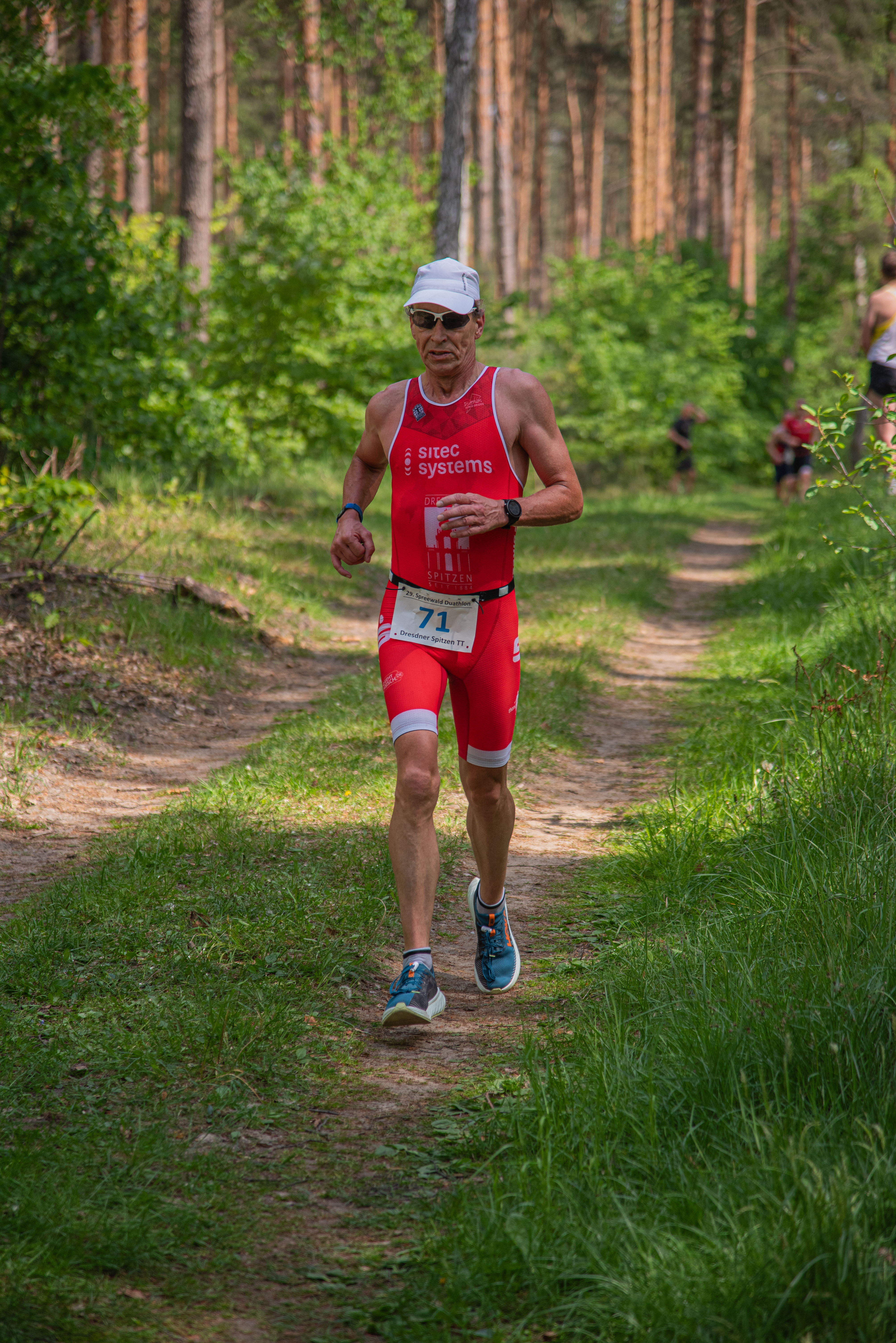 Der abschließende Lauf hat sich bei mir schlecht angefühlt, vermutlich meiner unzureichenden Verpflegung auf dem Rad geschuldet. Mit dem Ziel einfach irgendwie anzukommen und den Wettkampf vollständig zu absolvieren, habe ich mich über die letzten Kilometer gekämpft und musste feststellen, dass es anderen ähnlich erging. Am Ende der langen Zielgeraden konnte ich schon von weitem eine Gruppe rot gekleideter Personen ausmachen. Und tatsächlich hatten sich alle TV-Starter am Zieleinlauf versammelt, um mich mit einer Laolawelle ins Ziel zu begleiten.