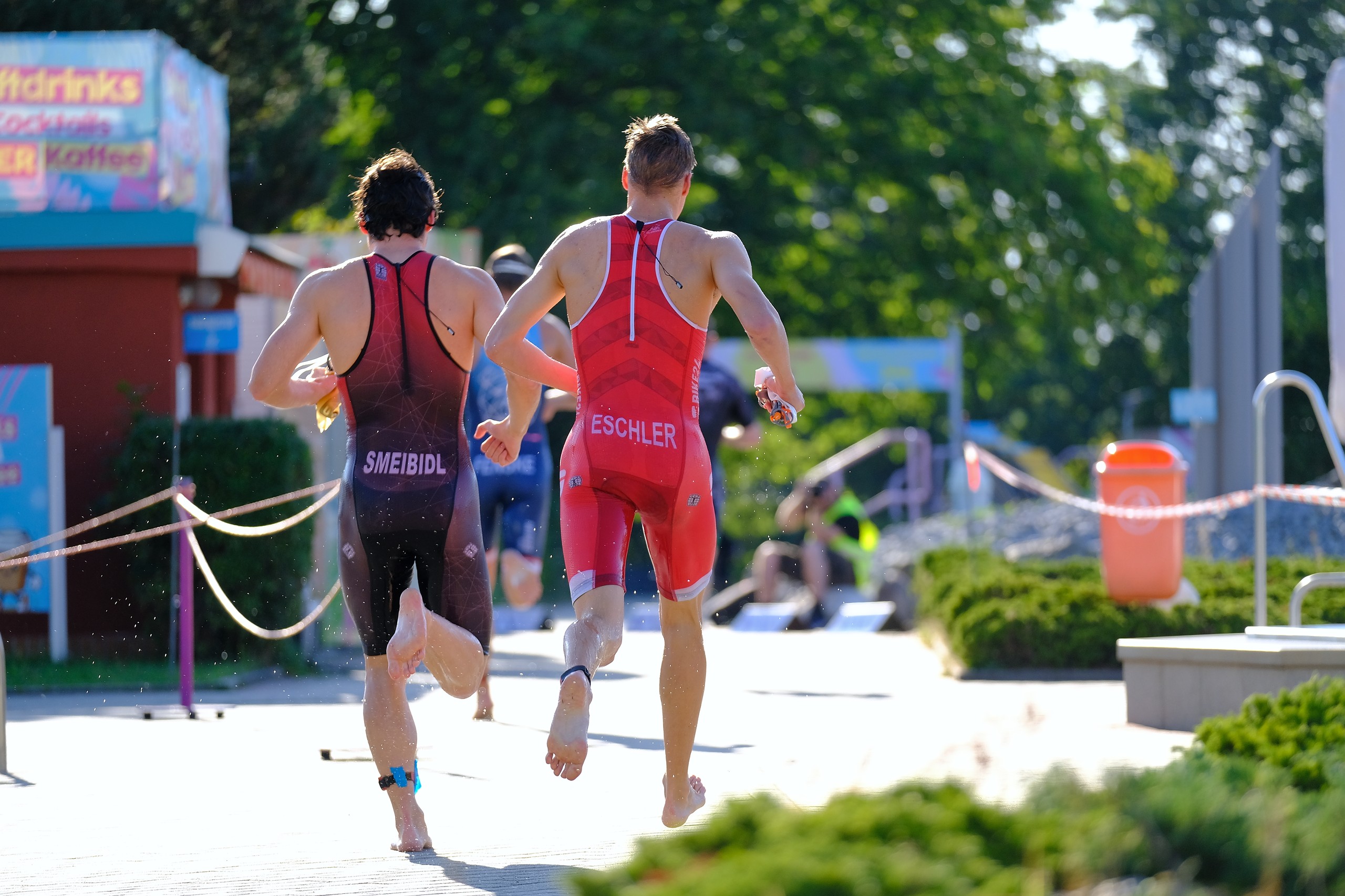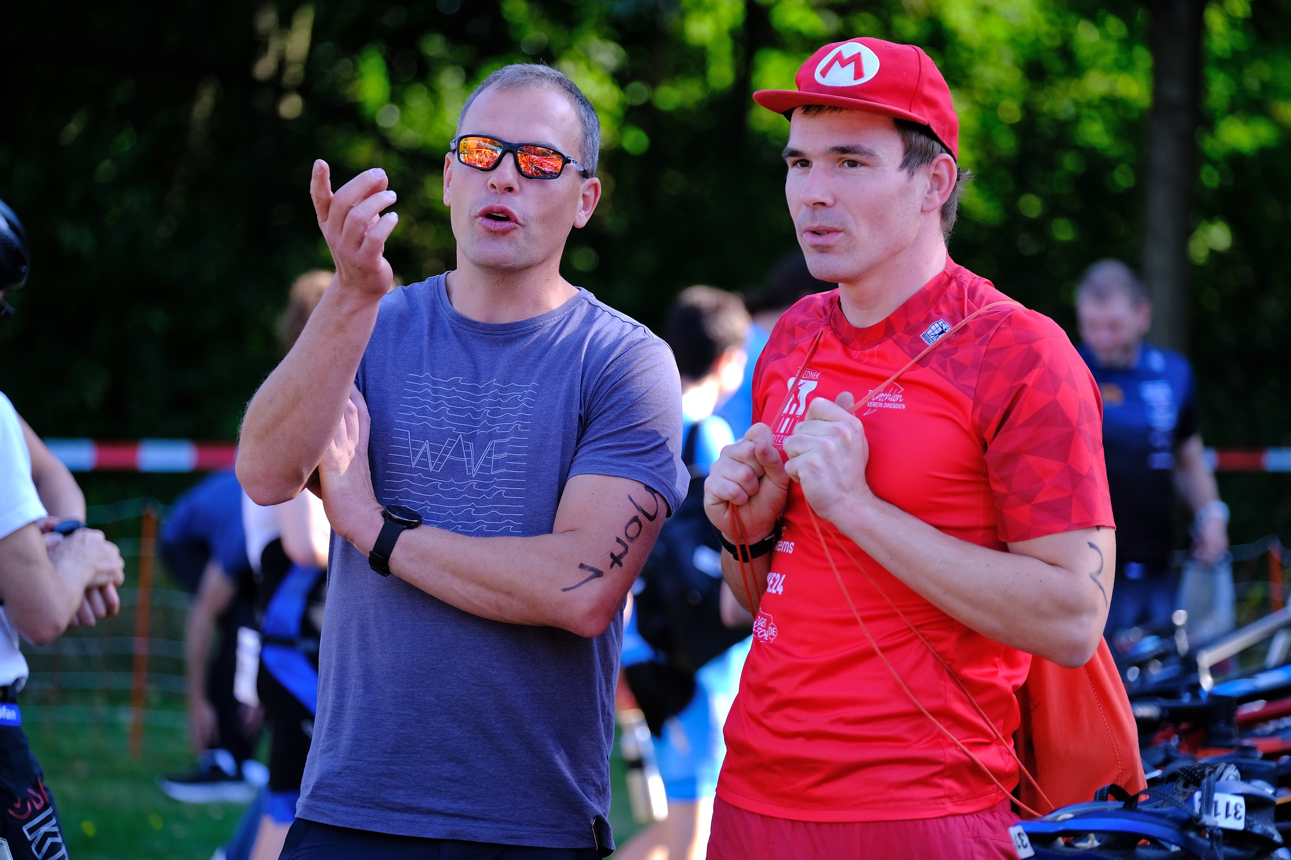 Fabio, der erste Starter bei den Masters, ging es beim Schwimmen etwas ruhiger an, denn er wusste, er würde durch seinen schnellen Rad-Lauf-Wechsel viele Sekunden wieder gut machen. Und tatsächlich...durch seinen blitzschnellen Wechsel, ohne die Schuhe zu wechseln, machte er wichtige Sekunden gut. Nebenbei angemerkt, sein Radfahren in Laufschuhen kann sich sehen lassen. Das Wettkampfformat macht es für den Betreuer zu keinem leichten Spiel den Überblick zu behalten und spätestens beim Wechsel auf die zweite Person, war dem Betreuer nicht mehr klar, an welcher Position welche Staffel lag. Was allerdings auffiel war der übermotivierte Athlet (der betreffende Athlet weiß Bescheid), der mehr als gefordert ablieferte. In dem Fall war es allerdings irrelevant, da es (sehr wahrscheinlich) nichts an dem Ergebnis geändert hätte. Wir merken uns: Dies ist stets zu vermeiden und nur wenn absehbar ist, dass es keinen Einfluss auf das Ergebnis hat (es wird nie absehbar sein), können Zusatzrunden absolviert werden.