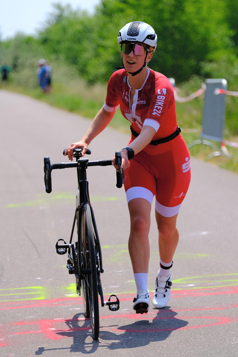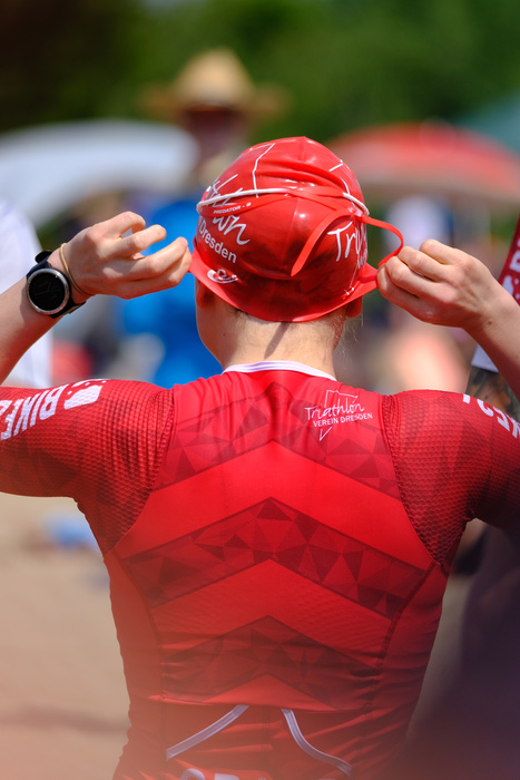 Nach der 2. Boje wage ich einen Blick nach hinten und sehe niemanden... also entweder liegt das an mir und dass ich nicht richtig gucken kann, oder ich werde als letzte aus dem Wasser kommen. Da nach vorne viele zu sehen sind, gehe ich vom Zweiten aus. Am Seeufer angekommen, folgt ein kurzer Sprint in den Wechselgarten, wo René auf mich wartet. Mein erster Gedanke: „okay Ines ist auch noch da. Martin ist also noch im Wasser.“ Und auch 2-3 weitere Radfahrer warten auf ihre Schwimmer. Ich bin also doch nicht die Letzte.