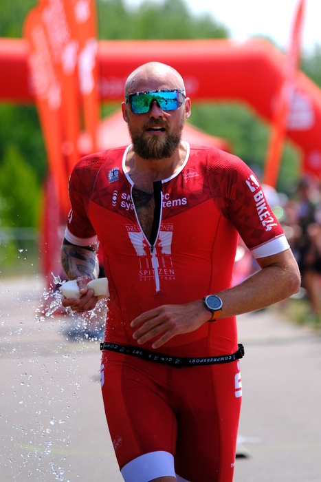 Nach etwa einer halben Stunde verlassen die ersten Radfahrer bereits wieder die Strecke; allerdings befinden sich in dieser Radgruppe keine TV-Athleten. Doch bereits in der folgenden Gruppe sahen wir einen roten Einteiler an der Spitze - René! Er war sehr schnell unterwegs und hat beim Absteigen trotzdem noch ein Lächeln auf dem Gesicht. Mit 33:37 Minuten auf knapp 22 km erreicht er die 7. beste Radzeit. Respekt.