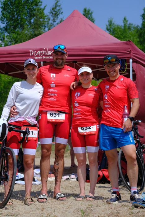 Tja und dann kam auch schon der Wettkampftag. Zum 1. Mal im neuen Format als Pärchen-Staffel. Heißt: unser Team bestehend aus 4 Startern - René, Martin, Ines und mir – teilt sich noch einmal in zwei Zweierpärchen auf. Jedes Pärchen absolviert die Sprintstrecke als Staffel, wobei uns selbst überlassen wird, welcher Partner welche der 3 Disziplinen übernimmt. Ein Teilnehmer muss also 2 der 3 Disziplinen übernehmen.