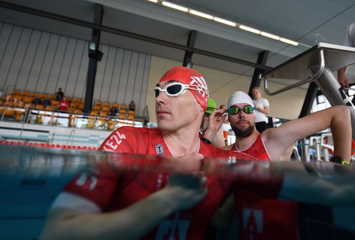 Nachdem wir alle die Nacht gut überstanden hatten, ging es an die Vorbereitung der Wechselzonen und anschließend zurück in die Schwimmhallen. Da die Männer als Letztes an den Start gingen, nutzen wir die Zeit, um gemeinsam die Frauen und Masters anzufeuern. Kurz darauf war es endlich so weit, wir gingen an den Start. Mit einem Rückstand von ca. 4 Minuten zum ersten Platz startete Tim als Erster von uns dreien, danach Robert und zum Schluss ich. Da die erste Wende mit Leine tauchen schief ging, waren die beiden auch erstmal weg. Was für mich bedeutete, noch einmal alles zu geben und aufzuholen. In den letzten 100 m konnte ich dann endlich wieder meine Gruppe erreichen.