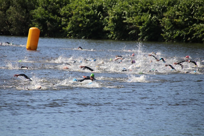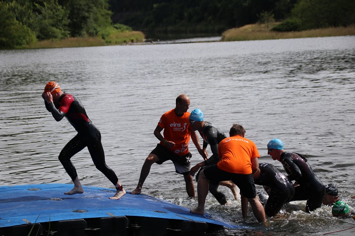 Nach einem kurzen Einschwimmen ging es dann auch endlich los. Mit insgesamt 90 Startern wurde aus dem Wasser gestartet. Die Strecke ging ca. 400m gegen die Strömung und dann das gleiche nochmal zurück. Ich bin soweit es ging an der linken Uferseite gestartet, was ich am Ende als sehr gut empfand. Natürlich ging es im Wasser wie eigentlich immer mit viel Körperkontakt zur Sache, aber ich hatte es schon schlimmer erlebt. Nach dem Schwimmen kam ich als Vierter unseres Teams aus dem Wasser, jedoch sehr dicht gefolgt von Christian.