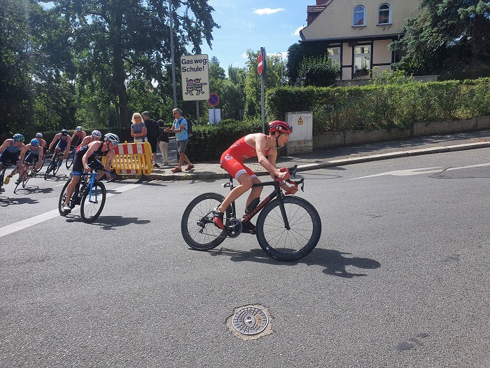 Das war schon eine sehr gute Ausgangssituation für unser Team. Dann gab es leider in der dritten Radrunde einen Sturz in der Gruppe. Ich und Christian waren glücklicherweise im vorderen Teil des Feldes und hatten nichts mit dem Sturz zu tun. Leider war Simeon in diesem Moment direkt hinter dem zu Sturz gekommenen Athleten, konnte nicht mehr ausweichen und ist leider mit gestürzt. Roman konnte zwar noch rechtzeitig bremsen, verlor jedoch den Anschluss zur Gruppe, da sich in diesem Moment eine größere Lücke auftat.