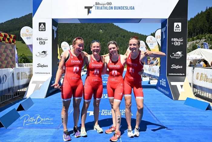 Pauline und ich sprangen gemeinsam vom Rad. Puh keiner hat gemerkt, dass ich keinen Plan hatte. Ich bin ihr einfach nachgelaufen. Der Wechsel lief super bei mir und ich konnte schnell wieder aus der Wechselzone flitzen. Dabei lief ich an eine Athletin ran. Ich habe mich etwas gefühlt, wie im falschen Film, denn normalerweise werde ich von der Gruppe überrollt. Mit einem weiteren Motivationsboost ging es also auf die 5 km. Wie schon erwähnt gab es einen Abschnitt mit Getränken, wo viele Helfer jubelten und anfeuerten. Das war ein tolles Gefühl. Wir musste zweimal eine 2,5km Schleife laufen. Ich denke den Zuschauern hat das viel Spaß gemacht und wir konnten wieder etwas Werbung für diesen tollen Sport machen.