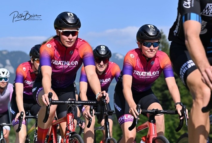 Der Weg zur Wechselzone war ziemlich lang, auch hier konnte ich ein paar Lücken schließen. Auf dem Rad galt es dann erstmal alles geben, um nicht alleine zu fahren und die Gruppe zu halten. Das gelang auch gut. Die Gruppe arbeitete dank Michelle Braun sehr gut zusammen. In Nürnberg saßen wir auch schon zusammen in der Gruppe, daher freute ich mich, dass es am Schliersee wieder geklappt hat. Bis zum Fuß des Anstieges wurde die Gruppe immer größer und arbeitete gut zusammen. Ich versuchte mich weiter vorn in der Gruppe zu positionieren, als es in den Berg ging. Alle Athletinnen schnauften und traten kraftvoll in die Pedalen. Die Schweißperlen kullerten übers Gesicht und als ich mich das nächste Mal umdrehte sah ich, dass unsere Gruppe nur noch aus 5 Mädels bestand. Das beflügelte mich und so schafften wir sogar den Anschluss an die nächste große Gruppe. Das Ende des Anstieges war mit einem Redbull Bogen gekennzeichnet und ich wusste, dass es dann erstmal bergab ging.