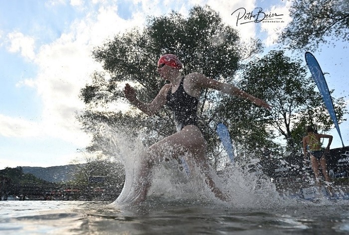 Der Start erfolgt. Es war alles etwas verwirrend. Die Männer starteten 10 Minuten vor uns und kamen aus dem Wasser, als für uns die Bundesliga-Musik lief. Die Musik war ziemlich leise und in der kurzen Pause zwischen Lied und Startschuss wurde ein Countdown eines anderen Liedes eingespielt. Die Männer stiegen aus dem Wasser und ich beobachtete die große Schwimmgruppe, als mir auffiel, dass jeden Moment der Startschuss für UNSER Rennen fallen würde. Glück gehabt und rechtzeitig zugehört. PENG und es ging los. Das Schwimmen ist für mich immer die größte Hürde, da ich hier die meisten Defizite habe. Ein Schwimmen wie in Kraichgau, wo ich als Vorvorletzte aus dem Wasser stieg, wollte ich zumindest nicht wiederholen. Ich erwischte dieses Mal immer wieder ein paar Füße und habe mich an der zweiten Boje in einer größeren Gruppe wiedergefunden. Das hat mich sehr motiviert und ich konnte am Ende in dieser Gruppe aus dem Wasser steigen.