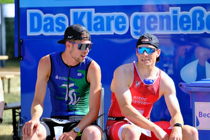Die Rennleitung war glücklicherweise sehr entspannt und flexibel: Ich hab neue Aufkleber von der „96“ bekommen, die wurde nicht vergeben, und eine 5 wurde mit Edding davor gemalt. Problem gelöst. Da ich schon fast 1,5h vor Rennbeginn das Thema klären wollte, hatte ich nun also reichlich Zeit – das Ganze dauerte keine 10 Minuten. Ich war der Erste beim Einchecken und beim Abgeben der Beutel in den Wechselzonen. Wieder mal Erster, ich brauchte noch ein Erfolgserlebnis. Ich bin dann barfuß ein paar Streckenabschnitte der Lauf- und Radstrecke abgelaufen, gefühlt 5 mal in die Schwimmhalle und wieder raus, bis dann endlich mal was los ging.