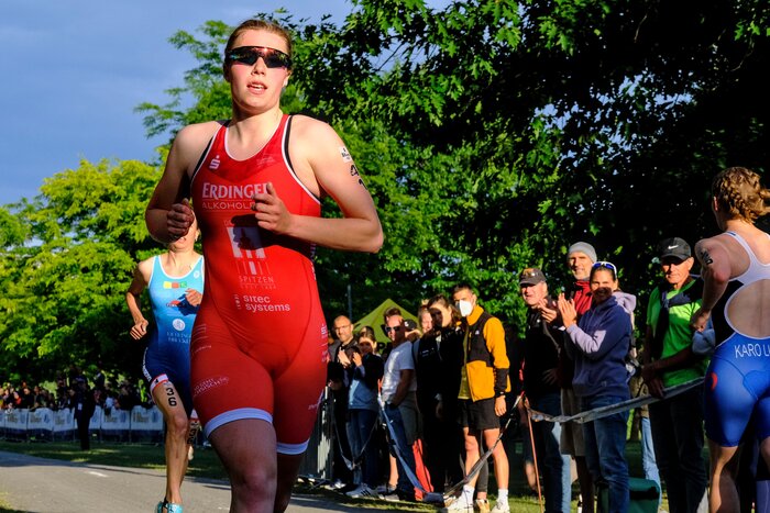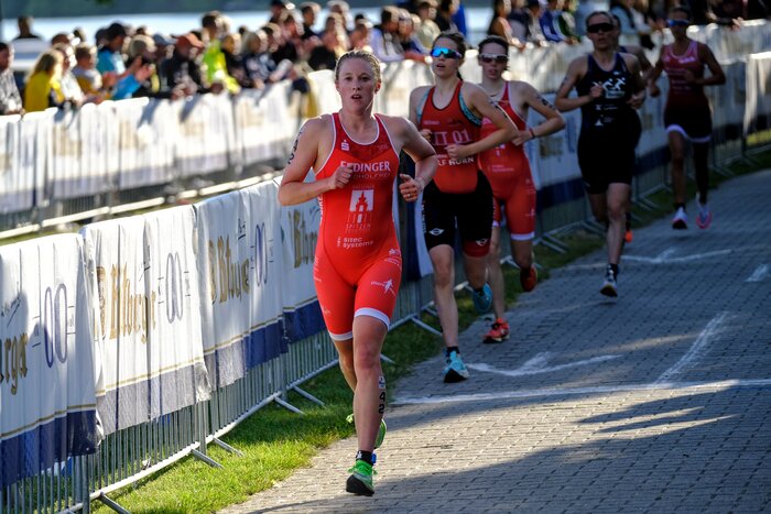 Die ersten Athletinnen springen auf ihr Rennrad. Darunter sind Namen, die man hier erwartet, z.B. die beiden deutschen Olympionikinnen Laura Lindemann und Anabell Knoll. Als erste Athletin im TV-Einteiler kommt Pauline um die Ecke. Sie erwischt ein grandioses Schwimmen und steigt als achte Athletin aus dem Hardtsee. Die kleine Spitzengruppe mit den beiden Olympionikinnen verpasst sie, wenn auch haarscharf. Diese ist sieben Athletinnen groß, die ordentlich auf die Kurbeln drücken und richtig Rennen fahren. Am Ende fahren sie 80 Sekunden schneller als die nächste Gruppe. M.a.W. der Vorsprung ist so groß, dass die ersten sieben Plätze an Athletinnen aus dieser Gruppe gehen.