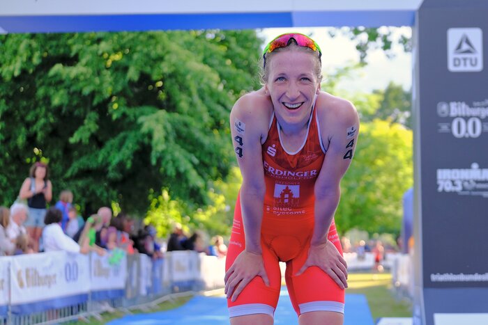 Caro Pohle biegt nach der letzten Laufrunde in den Zielkanal ein und die Anspannung, die sich den ganze Tag über aufgebaut hat, und auch der Frust über ihr Schwimmen fällt von ihr ab. Sie wird 14. Das ist nicht ganz die Platzierung für die sie tagtäglich rausgeht und trainiert. Ausschlaggebend war heute das Schwimmen. Hier kommt sie nicht gut vom Start weg und verpasst auf dem Weg zur Wende den entscheidenden Zug. Beim Rad leistet sie in der zweiten Verfolgergruppe viel Arbeit und geht mit ordentlich Wut im Bauch auf den Lauf. Wie der Wolf in Rotkäppchen-Gestalt sammelt sie fleißig Athletin und Athletin ein und macht Plätze gut. Im Ziel ist ihr die Verärgerung über das Schwimmen deutlich anzumerken. Auf den Lauf angesprochen grinst sie breit. Meine Wahrnehmung von Außen und ihre Selbstwahrnehmung scheinen übereinzustimmen. Die Trainingsaufgabe bis zum nächsten Rennen ist klar.