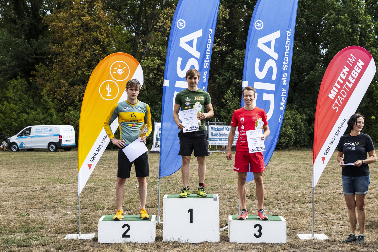 Nach dem Startschuss ging es für uns zunächst flussabwärts in der Saale bis zum Wendepunkt und anschließend wieder einige Meter stromaufwärts bis zum Schwimmausstieg. Endlich hatte ich mal ein richtig gutes Schwimmen. In der morgendlichen Sonne war das Schwimmen im Fluss ein toller Einstieg in den Wettkampf. Auf dem Rad angekommen ging es sofort ans Eingemachte. Die Radstrecke, eine 5km Runde, die es viermal zu fahren galt, war sehr kurvig und teils mit rauem Straßenbelag bestückt. Eine solche Strecke ist sicherlich nicht jedermanns Geschmack, ich kann nur sagen: es hat richtig gefetzt. Zugleich möchte ich eine derartige Strecke jedoch nicht unbedingt bei Regen fahren. Beim Radabstieg lag ich mittlerweile auf Platz 2, direkt hinter mir kam auch schon Marco angeflogen. Beim Laufen gibt es in so einer Situation eigentlich nur eine Devise: laufen was das Zeug hält. Sowas in der Art habe ich dann auch gemacht, leider konnte ich einen fliegenden Berliner nicht halten. Am Ende reichte es damit für den 3. Platz. Wieder auf dem Podium der Regio, jawoll! Im Ziel hieß es dann warten auf die nächsten roten Einteiler. Die kamen in Form von Marco und Robert auch innerhalb kurzer Zeit eingelaufen. Das Team der Friesen Weltraumjogger war an diesem Tag jedoch nicht zu schlagen und so landete das unser Männerteam 1 auf dem 2. Gesamtrang. Das zweite Männerteam kam im Mittelfeld auf Rang 6 an.