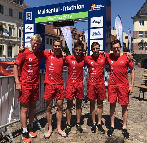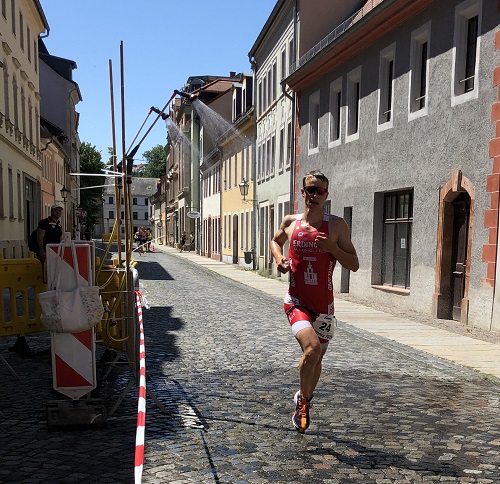 „Was ist brutaler? 13°C und Dauerpiss wie vor einer Woche bei Teammate Markus oder 40°C und Sonne? Die aufgrund der Temperaturen angenehmste Disziplin an diesem Tag fand gleich zu Beginn des Wettkampfes statt. Dabei war aber einzig die Temperatur des kühlen Nasses cool. ? Nach einem Schwimmen mit einigen Schlägen, Tritten und auch Zügen auf der Stelle bzw. ohne Raumgewinn konnte ich in der Mitte des Teilnehmerfeldes aus dem Wasser steigen. Mit einem schnellen Wechsel ging es aufs Rad. Ich befand mich zu diesem Zeitpunkt kurz hinter der dritten Radgruppe. Nach 4 Kilometern gelang mir zusammen mit anderen Athleten der Anschluss zur vor uns fahrenden Radgruppe, die mittlerweile aus ca. 25 Leuten bestand und bis zum Ende des Radfahrens noch anwachsen sollte. Da grundsätzlich eine Positionierung im vorderen Drittel einer Gruppe sehr viel Aktionsraum und auch Kraftsparpotential bietet, versuchte ich mich gleich an die Spitze zu schieben. Schon in der ersten Runde gelang es mir (eigentlich ungewollt) eine Lücke von einigen Sekunden zu reißen. Also blieb ich einfach auf dem Gaspedal und versuchte meinen indirekten Heimvorteil durch unzählige Trainingsfahrten im Muldental auszuspielen. Nach 5min war der Ausreißversuch leider schon vorbei, da hinten kurzzeitig Einigkeit herrschte, die im gesamten späteren Rennen nie zu spüren war... Nach kurzer Absprache mit Andreas versuchten wir unser Glück eine Runde später, an gleicher Stelle, noch einmal. Leider wurde auch dieses Unterfangen sehr schnell im Keim erstickt. Damit hieß es sich so langsam auf den Lauf vorzubereiten. Den Abstand zu den beiden Gruppen mit insgesamt 10 Leuten konnten wir aufgrund des nicht gleichmäßig hohen Tempos nur etwas verringern. Als Fünfter der Hauptgruppe ging es für mich vom Rad. Sofort schlug uns die Hitze von 38°C in den engen Gassen von Grimma ins Gesicht. Nach einer Runde purem Kampf konnte ich mich aber etwas herunterkühlen. Mit dem Gefühl eines Teamrennens, Schulter an Schulter mit Christian und Andreas, konnte ich schließlich mein Ergebnis vom letzten Jahr einstellen. Insgesamt können wir denke ich zufrieden sein. Das Gesamte Team in den Top 50, auf diese Leistung können wir aufbauen... und in dieser Liga sind 30s schneller laufen mal eben auch 20 Plätze weiter vorn! Nebenbei hatte ich vor allem auf dem Rad sehr viel Spaß. Deshalb vielen Dank für ein super Rennen und eine tolle Saison! Es war mir eine Freude Teil der Mannschaft zu sein, umso mehr drücke ich jetzt den Jungs für das letzte Rennen in Verl die Daumen! ?”