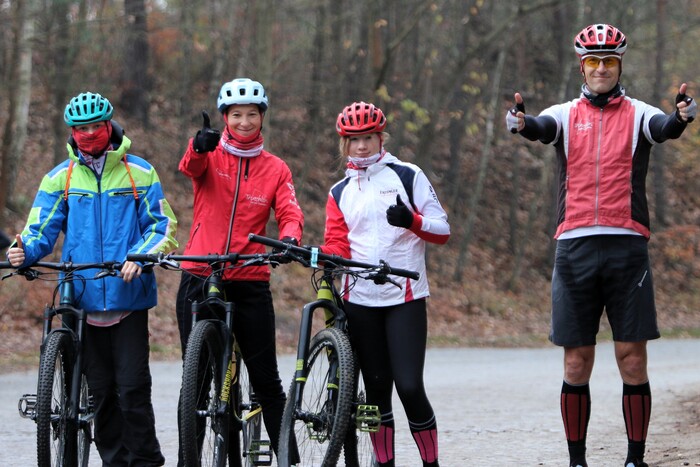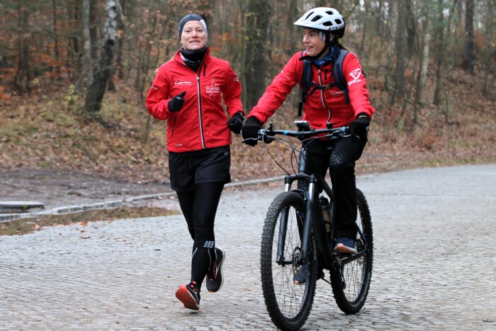 ... um im Abstand von fünf Minuten auf die 17,7 km lange Strecke zu starten. Die Mannschaften bestanden aus zwei bis vier Menschen unterschiedlicher Alters- und Leistungsklassen. Bei strahlendem Sonnenschein und herbstlichen Temperaturen bewegte sich je ein Mannschaftsmitglied laufend fort, während die übrigen Mannschaftsmitglieder auf Rädern versuchten hinter her zu kommen. Die Wechsel waren genauso individuell, wie die Laufgeschwindigkeiten und konnten frei eingeteilt werden. Während einige Mannschaften mit Messern zwischen den Zähnen unterwegs waren, ließen es andere besinnlicher und gemütlicher angehen. Die Runde führte über den Kannenhenkel, über die Hofewiese und den Prießnitzgrund zurück Richtung Marienallee. Landschaftlich und atmosphärisch immer auf höchstem Niveau, war die Strecke bis zur Hälfte auch etwas hubbelig.