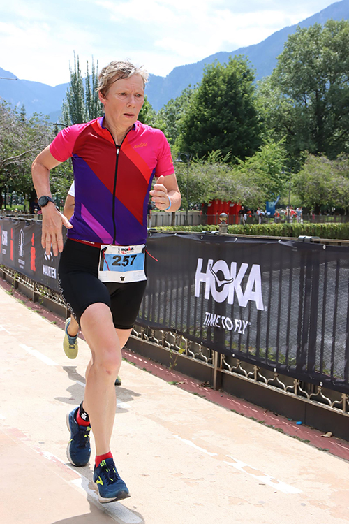Roland flüsterte mir noch zu, er hätte gehört, dass es einen Landgang geben sollte. Ich ordnete mich ganz frech ziemlich vorn ein…für eine Schwimmzeit von ca. 20-25 min. Schwimmstart einzeln, alle 2 s. Landgang war und das zweimal. Das Wasser war kalt und lag bei 16° C. Ich, eher als ein schlechter Schwimmer unterwegs, hatte keine besondere Zeit erwartet. Kaum auf dem Rad, fuhr ich rund 7 km bergab. Dann folgte, was soll ich sagen, bergauf. Mit dem Auto die Strecke vorher abgefahren, hatten Roland und ich noch großspurig überlegt, mit welchem Tempo wir die Höhenmeter bewältigen könnten. Tja, wie immer, es kommt anders. Breite Straßen minimieren optisch die Steigung durch ihre Breite. Eine schmale Straße, die später auf den in rund 2000 hm liegenden Pass führte, fuhr sich wesentlich leichter.