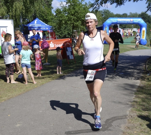 Die vorbei rauschenden Halbdistanzler verschafften Ablenkung. Ich joggte von einer Versorgungsstation zur nächsten. Ausreichend Kühlung verschafften die Schwämme. Wasser, Salz und etwas Cola waren neben meinem Kopf die Helfer, um von einer Runde in die nächste zu kommen. Überholt wurde ich von zwei Frauen und damit war ich auf Platz 4. Die Schatten wurden länger. Die Temperaturen wurden angenehmer. Auf der letzten Runde versuchte ich etwas schneller zu laufen und somit erfüllte mich mir den Wunsch, den Marathon knapp unter 5 Stunden zu beenden. Eine kleine Siegerehrung, extra für mich, 2. Platz der AK, folgte prompt.