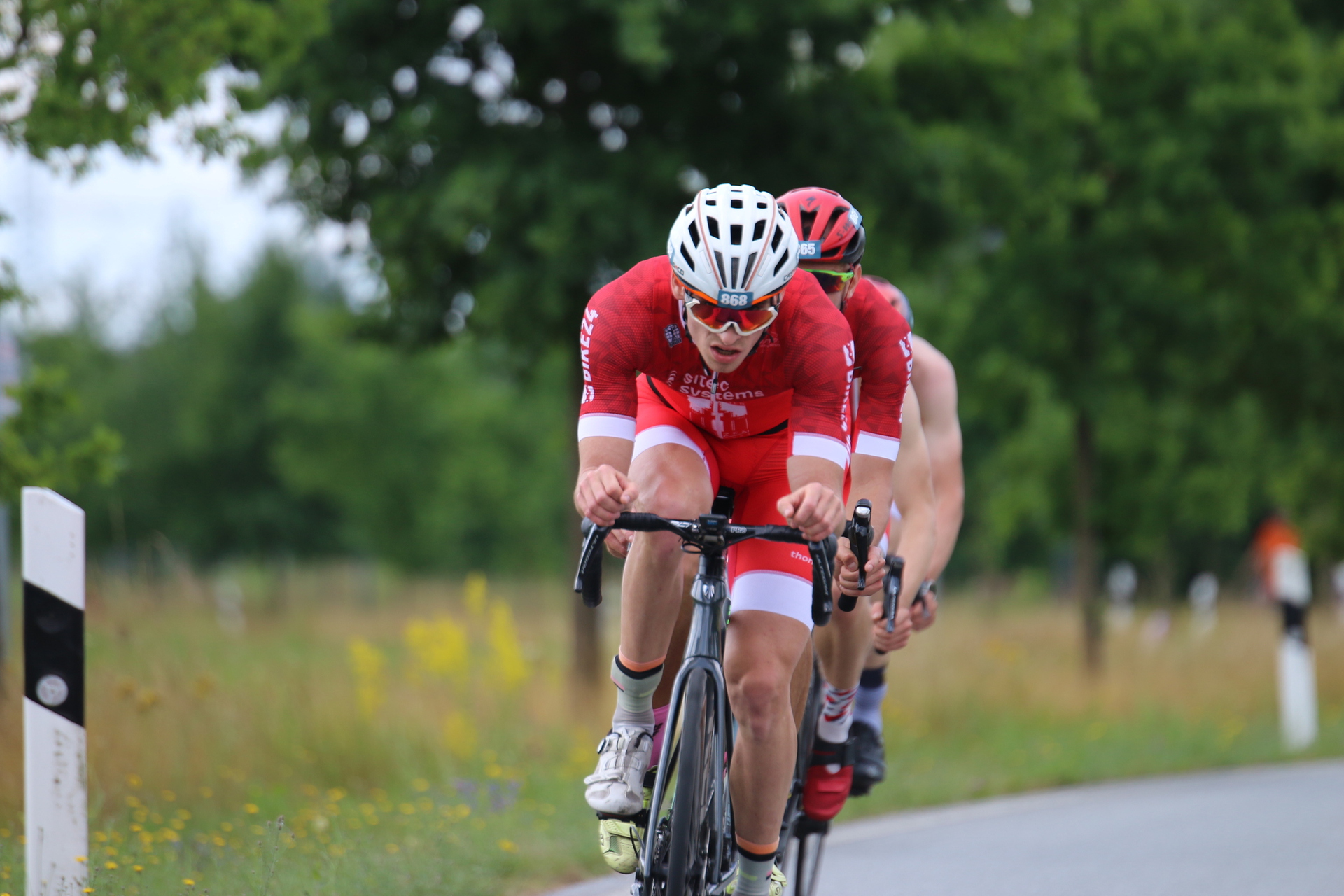 Zunächst galt es ein Mannschaftszeitfahren über 40km (Männer) bzw. 20km (Damen) auf einem welligen Kurs zu absolvieren. Dabei konnte sich die 1. Männermannschaft bestehend aus Stephan, Marco, Marvin und mir (Robert) mit ca. 2min Rückstand auf die führende Mannschaft aus Weimar eine gute Ausgansposition für die anschließende Swim&Run Staffel sichern. Extramotivation gab es zu Beginn unserer 2. Radrunde. Hier trafen wir die eben gestartete Damenmannschaft, bestehend aus Pauline, Sophie und Manu, welche später mit 35s Rückstand auf das Team „maxx-solar Triathlon Thüringen/TV Dresden“ von der Radstrecke gingen. Die 2. Männermannschaft (Carsten, Otto, Grahlo, Christian) erreichte trotz zweifachem Verfahren mit nur etwa 5min Rückstand Rang 7 (von 12) beim Radfahren.