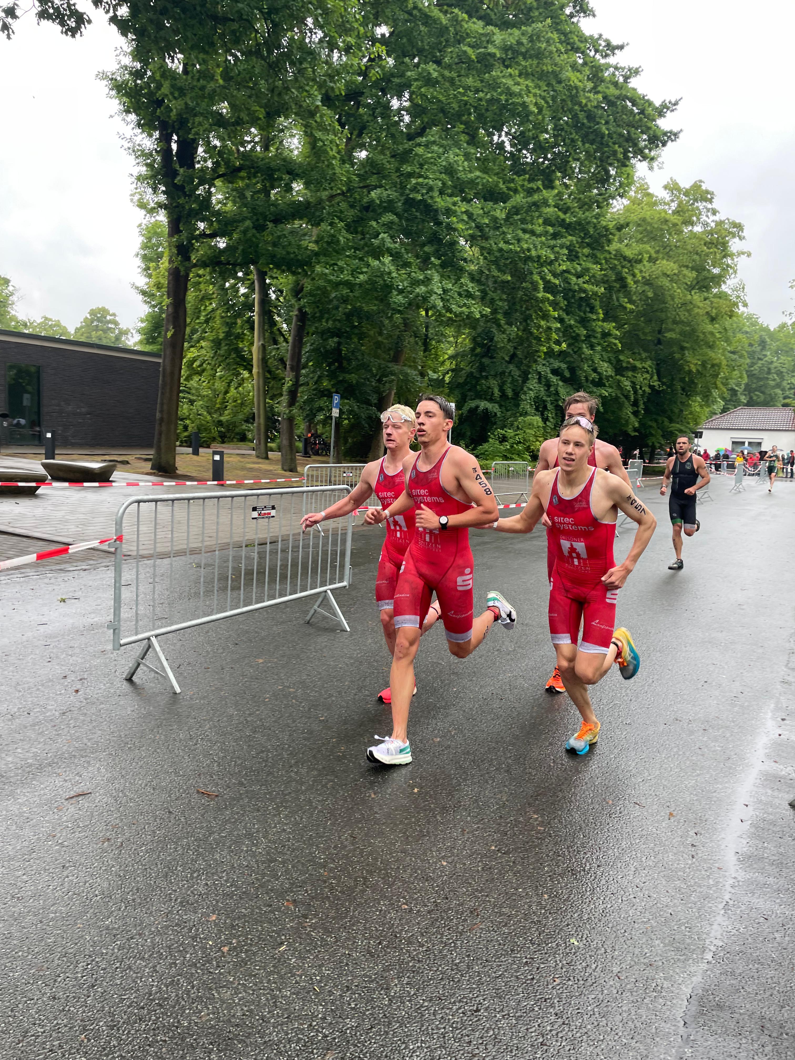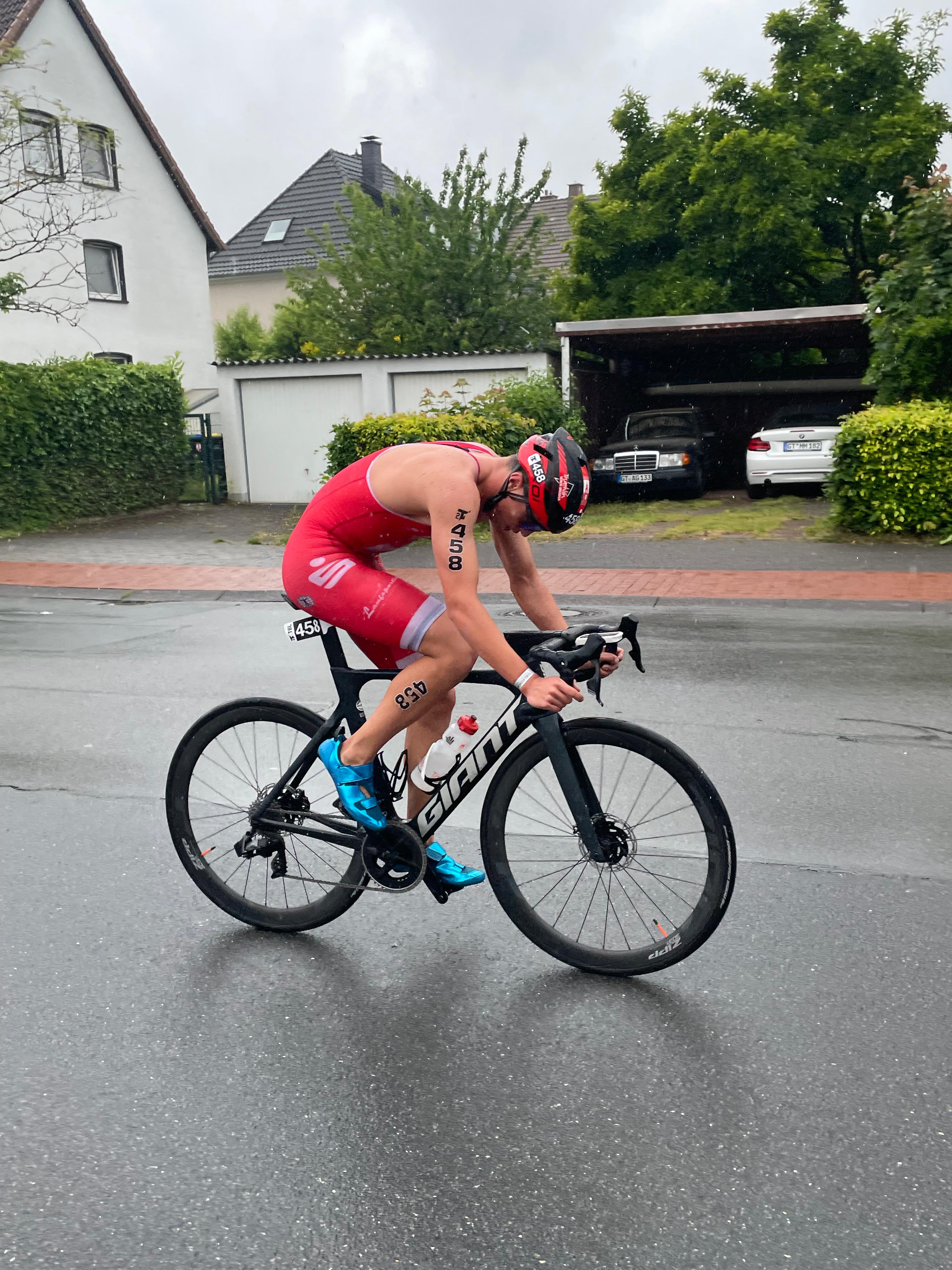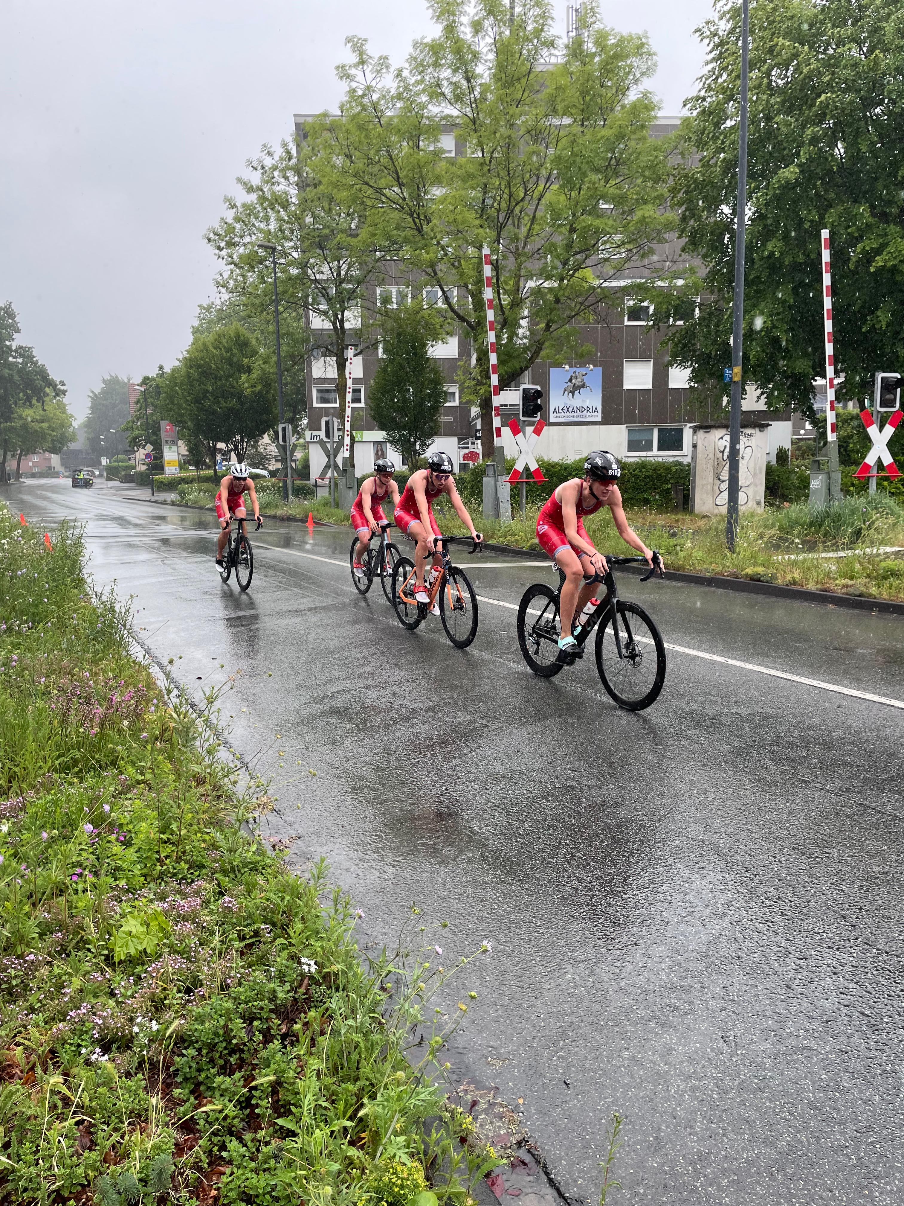 Nachdem 150 m später die Weimarer Ingenieure das Wasser verließen, kehrte etwas Ruhe auf der Bahn ein. Es war deutlich zu sehen, wie unser 5er Gespann den Abstand zu später gestarteten Teams ausbaute und zu vorderen Teams verkleinerte. Jonah, der als erster das Tempo vorgab, konnte durch regelmäßiges Schauen in den Rückspiegel die Gruppe zusammenhalten. Nach 750 m ging es schnell durch die Wechselzone und aufs Rad. Mit dem Hintergedanken im Kopf, dass die Strecke nass und glatt ist, hieß es nun „Abfahrt“. Laut Erzählungen muss die Radfahrt von einigen Überholvorgängen gespickt gewesen sein. Nach der ersten Runde war das Team leider nur noch zu 4., Christian war abgefallen. Die vier verbliebenen Herren ließen sich davon nicht beirren und traten kräftig in die Pedale.