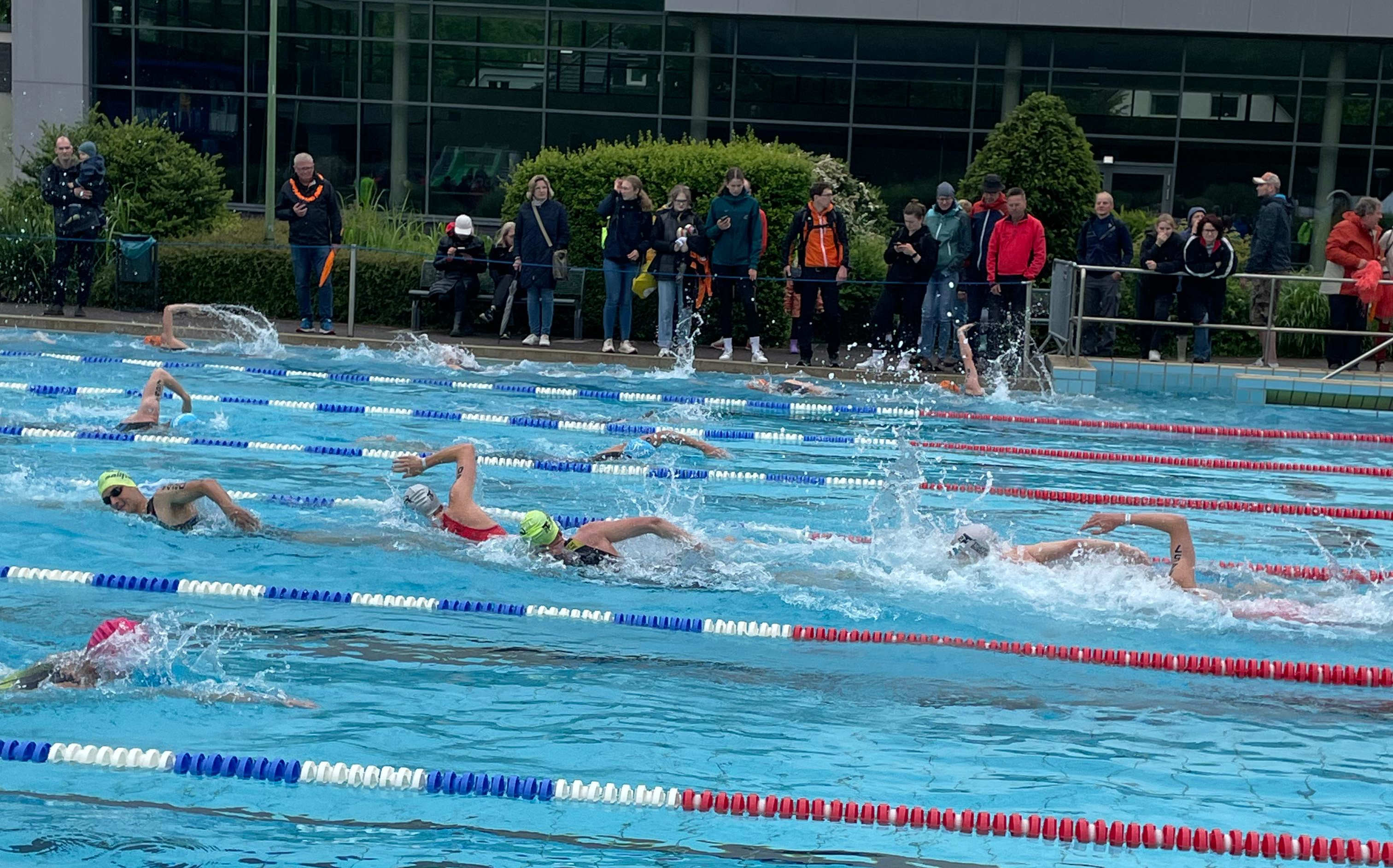 Unser Herrenteam war mit erfahrenen Sportlern am Start: Das Jugendtrio mit Jonah Lange, Ole Eschler und Till Altmann, welche parallel zu den Ligawettkämpfen auch am DTU-Jugendcup teilnehmen, Oliver Uldahl Bruun, der unser Team schon seit mehreren Jahren aus Dänemark unterstützt und Christian Pfeifer, einer der Athleten mit der längsten Bundesligaerfahrung im Verein. Am Samstag hatte Christian noch mit Magenproblemen zu kämpfen, fühlte sich glücklicherweise Sonntag früh wieder fit genug, um starten zu können. So kehrte auch beim Betreuer etwas Ruhe ein, der als Reserve vorgesehen war. Bei Regen und Lufttemperaturen im Bereich von 16 °C musste jeder für sich abwägen, ob das Einschwimmen sinnvoll ist oder nicht. Zumindest war das 50 m Becken auf 24 °C beheizt. Gestartet wurde im Abstand von einer Minute auf separaten Bahn nach dem Endergebnis aus der letzten Saison, wobei nach 8 min, also nach dem 8. gestarteten Team, die Bahnen doppelt belegt wurden. Nach Platz 12 in der vergangenen Saison starteten wir um 11:11Uhr auf Bahn 4. Pünktlich um 11:11Uhr waren allerdings auch die Weimarer Ingenieure, die 8 min eher gestartet waren, an der Wende. Von außen betrachtet sah es nach einem drüber und drunter aus. Das 10er Pack machte das Beste draus.
