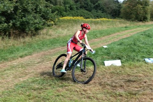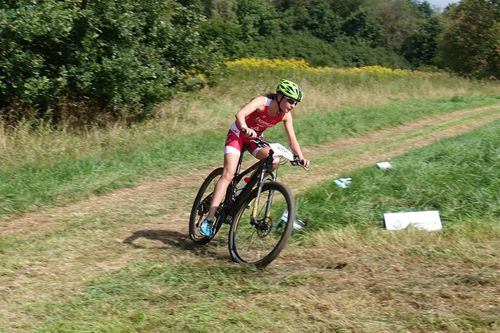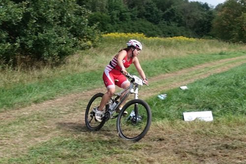 Der Wechsel klappte bei mir prima. Auf dem MTB gings erst über ein Feld und auf einen Schotterweg. Dann gings auf einem Trail immer nach oben. Hoch zu überholten mich ein paar Jungs, welche ich aber auf dem Weg nach unten wieder einholte. Als letztes musste man eine Runde um den Kristina-See laufen.