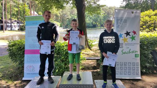 Über Umwege erreichten wir trotz Stau noch rechtzeitig den Wettkampfort im Waldbad Weixdorf. Mit dabei waren auch noch Marleen, Adam und Christian. Die mussten aber mit Nichttriathleten starten. Außer Christian starteten wir alle in derselben Altersklasse. Trotz unseres Vorteils mit vier Triathleten malten wir uns gegen Adam wenig Chancen aus – zumal wir als einzige 3. Klasse die Jüngsten waren.
