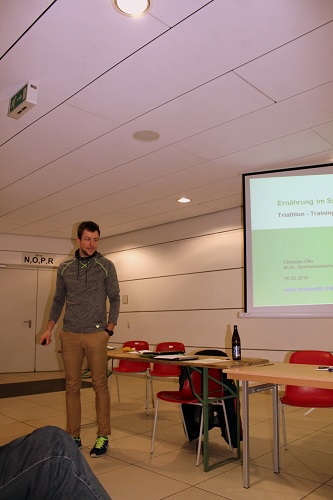 Als wirkliches Highlight gab es an diesem Abend einen wissenschaftlichen Vortrag hinsichtlich Ernährung im Sportbereich, mit Fokus auf Triathlon, durch Christian Otto (>Homepage<). Als Junior im TV ausgebildet, geht er seit 2005 eigene Weg und hat den Sprung an die deutsche und europäische Spitze geschafft. Er referierte etwa eine Stunde über "Go's" und "No Go's" im Triathlonsport. Seine Anekdoten, welche teilweise von im selbst waren, rundeten den insgesamt authentischen Vortrag positiv ab, und somit war die Gelegenheit für das fachkundige Publikum da, um ihn Löcher in den Bauch zu fragen. Wer gern mehr über ihn oder seine Methodiken erfahren möchte, schaut am besten selbst nach auf seiner >Homepage<, oder fragt ihn direkt an.