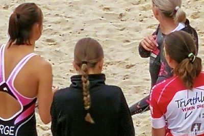 Maria ging also auf den 750 Meter langen Dreieckskurs, während sich Marleen und Lydia auf den Weg in den Wechselgarten machten. Nach nur etwa elf Minuten hieß es aus den Lautsprechern, dass die ersten Schwimmer aus dem Wasser kommen, vorne dran eine Frau.