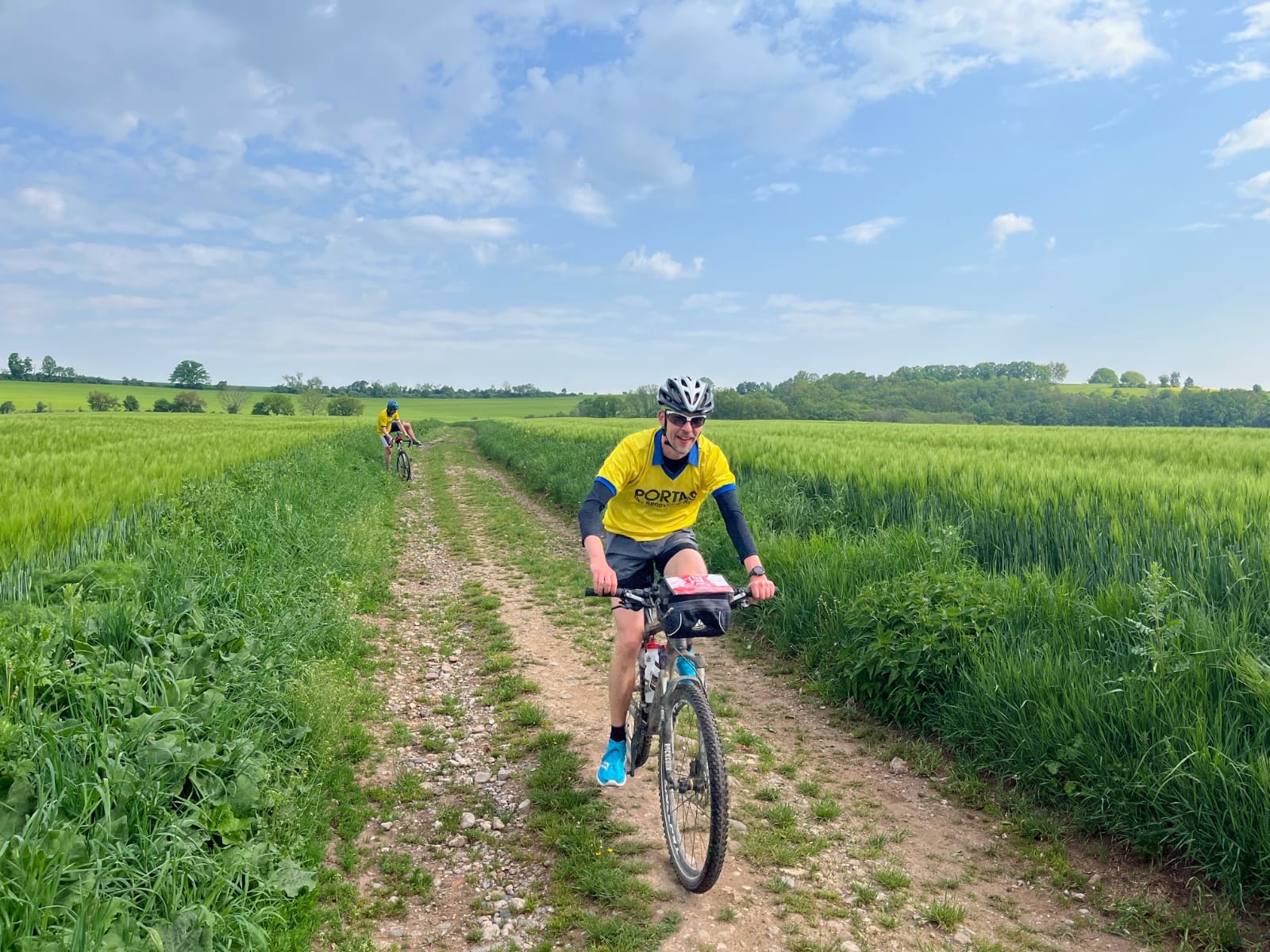 19 Berge hat der Fahrradcomputer ermittelt - 2-3 davon würde ich auf der Schmerzskala von 1 bis 10 bei einer guten 8 verorten. Der geneigte Leser kann es gerne selbst versuchen - bei losem Untergrund und ab ca. 5% Steigung wird der Läufer schneller als der Radfahrer. Das bedeutet zum Einen, dass die Strecke auch mit dem Fahrrad eine Herausforderung ist und zum Zweiten, dass Taktieren mit vorausfahrenden Fahrrädern und geschickter Platzierung am Berg ein Schlüssel für eine flotte Zielzeit ist. Eine unbekannte, neue Strecke bietet da nochmal eine besondere Herausforderung, aber das ging ja allen Teams so.