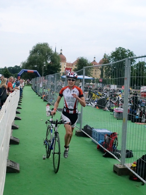 Die folgenden Minuten verliefen ausnahmsweise mal planmäßig. So kam Konstanze nach Umrundung des Schlossteiches inklusive einer langen Tauchphase um die kreuzenden männlichen Einzelstarterkollegen zu queren nach 31min aus dem Wasser. Das Warten in der Staffelwechselzone ist unerträglich, jeden Moment kann es losgehen, von null auf 100.