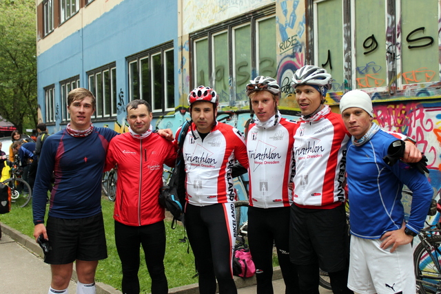 Der 1. Start zu dem 100km-Rundkurs vom Gymnasium Dresden-Plauen aus erfolgte um 07:30 Uhr und danach im 1-Minuten-Takt. Zuvor mussten noch die Startunterlagen abgeholt und bestätigt werden, dass man sich in vollem geistigen Bewusstsein und ohne Regressansprüche an den Veranstalter auf die lange Strecke wagt. Nach einer kurzen Taktik-Besprechung ging es dann 08:20 Uhr für uns los.