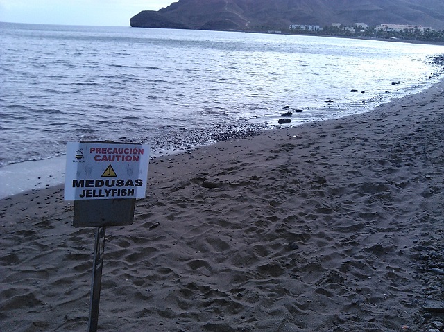 Die schweren Beine nach der intensiven Trainingswoche waren dann Richtung Wettkampf auch weniger das Problem. Das waren eher unerwünschte Meeresbewohner: Bereits am zweiten Tag unseres Aufenthaltes stürzten wir uns motiviert mit den im Winter verstaubten Neos in die Fluten des Atlantiks. Das Wasser fühlte sich super an - so um die 20 Grad - und wir schwammen zur ersten Boje. Doch was waren denn das für schleimige, rote und blaue, verzottelte Dinger? Ohje, es wurden immer mehr und plötzlich war mir nur noch zum Schreien zu Mute: Wir schwammen mitten in einem Quallenschwarm. Rajko hat sich gewundert über meinen Schreianfall und schwamm ganz straff sein Programm weiter. Quallen kannte er ja nur von der Ostsee, etwas eklig, aber doch kein Drama. Quallen waren mir aber schon öfters als sehr unangenehme und auch recht gefährliche Meeresbewohner aufgefallen. Also schwamm ich so schnell ich konnte zum Ufer und Rajko kam dann doch auch nach einer Weile, weil ihn etwas am Fuß brannte. Der Fuß wurde immer röter und schwoll auch schnell an – ihn hatte eine Qualle erwischt. Ich holte im Restaurant im Nebenort schnell Essig und dachte schon, dass das jetzt das Ende des Trainingslagers für Rajko war. Zum Glück half der Essig schnell und der Fuß sah nach einem halben Tag wieder normal aus. Mit Freiwasserschwimmen war es dann aber auch erst einmal essig. Das Schild „Caution, Jellyfish/ Precaucion, Medusas“ entdeckten wir leider erst nach dieser Aktion....