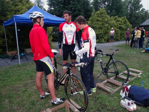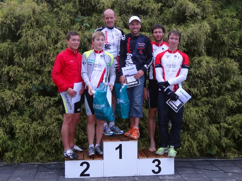 Die drei Radrunden, die mit einem Slalomlauf um Pfützen aus dem Wechselgarten heraus begannen, über Wellen, des nicht ganz ebenen Straßenbelages, um mehr oder weniger scharfe Kurven weiter führten, verliefen nicht ganz den Erwartungen der TV´ler. Die Gesamtführung konnte nur bis zur Mitte der zweiten Runde des ersten Starters verteidigt werden. Ab dort übernahm der Niederschlesier Andreas Unruh mit einer sehr respektablen Radzeit die Gesamtführung. Sein Partner Carsten Riegel verteidigte diese dann bis in das Ziel. Auf den letzten Laufmetern der beiden Runden um den Natursee Pirna Copitz konnte Alex aufgrund seines Laufturbos noch an Martin vorbeilaufen. Dadurch erkämpfte er sich und Moritz den zweiten Gesamtplatz. Ob Silber oder Bronze war dann auch egal, Martin und Rico liefen auf dem 3. Platz ein.