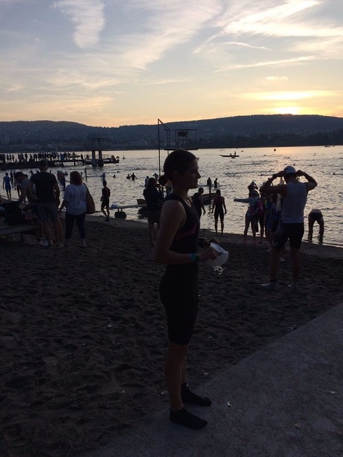 Dort herrschte bei unserer Ankunft schon reges Treiben und eine leicht angespannte Vorstartatmosphäre lag in der Luft. Nach einem kurzen Radcheck und einem noch kürzeren Einschwimmen reihte ich mich schon im Rolling Start ein. Geschwommen (ja, bei uns fand das Schwimmen statt) wurde eine große Runde im herrlich klaren und im Gegensatz zum Vortag ruhigen Zürichsee. Aufgrund der hohen Temperaturen der Wochen zuvor lag die Wassertemperatur deutlich über der Neoverbotsgrenze. Wir schwammen also ohne Neo, was mir aber ganz recht war. Das Schwimmen ging relativ unspektakulär vorüber und nach etwas über einer Stunde verließ ich als 11. Frau das Wasser.