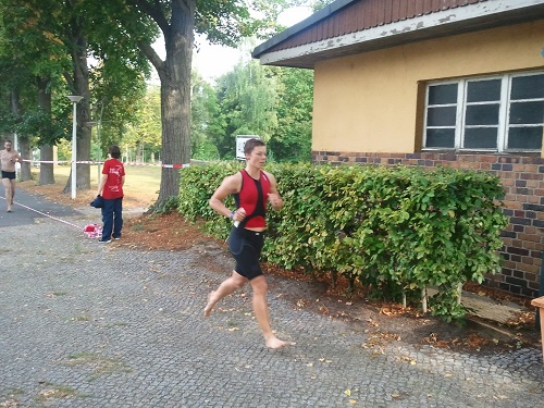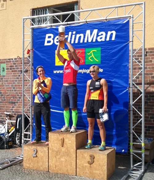 12 Uhr gab’s eine kleine Siegerehrung und 17:30 Uhr dann die richtige…Ja, 5,5 Stunden später. Wir dachten, wir könnten nach 12 Uhr gleich zum Knappenman düsen, um unsere Liebsten noch zu sehen…Pustekuchen! Wir nahmen also etwas Marschverpflegung und schlichen uns noch schnell ins Strandbad, bevor das Hintertürchen geschlossen wurde. Wir setzten uns illegalerweise in einen Strandkorb und ruhten vor uns hin. Curt nutzte noch die Gelegenheit, um Baden und Rutschen zu gehen, auch wenn kein Badewetter war…er hatte doch aber extra die Badehose eingepackt! Dann fütterten wir noch die Kamikaze-Enten, die sich gegenseitig pisakten, um etwas abzubekommen. Als es dann etwas zuzog und einer umherlief, um die Strandkorbgebühr einzutreiben, packten wir unsere Sachen zusammen und gingen. Wir aßen noch lecker Nudeln in der Stadt und erschienen pünktlich zur Siegerehrung. Neben einem Plastepokal mit Rechtschreibfehlern gab es eine leckere Torte, eine Blechmedaille, eine Umhängetasche mit Berlinman-Symbol und ein Weltmeistertrikot, was wirklich gut gelungen ist und sogar passt.