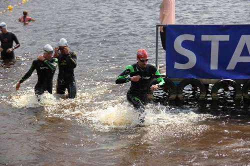 In diesem Jahr treten die Dresdner Triathleten mit ganzen vier Teams an: eine Frauenmannschaft, zwei Männerteams und ein Mastersteam. Nach einer gemütlichen Fahrt in guter Gesellschaft und dem üblichen Check-In Prozedere war alles angerichtet für den Showdown. Der Start steht kurz bevor und die Männergruppe in schwarzen Tarnanzügen formiert sich im Wasser. Die ersten Meter im Wasser waren diesmal ziemlich rau. Überall um mich herum versuchten alle übereinander zu schwimmen. Klappt meist nicht so gut, aber man kann es ja mal versuchen. Nach den ersten 100 – 200 m hatte sich das Feld entzerrt und gemeinsam mit Martin konnte ich ein gutes Tempo schwimmen. Zusammen mit Jens ging es aus dem Wasser raus über den blauen Teppich zum ersten Wechsel.