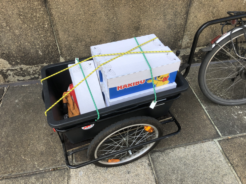 Die Abholung wurde gleich als Krafteinheit auf dem Rad durchgeführt. Mit Anhänger und 20 kg Zuladung ging es von der sächsischen Staatskanzlei zum Athletikraum wo die Leckerei aktuell lagert. Gummibärchen sind die ideale sächsische Sportverpflegung, da sie ohne harte Konsonanten auskommen.