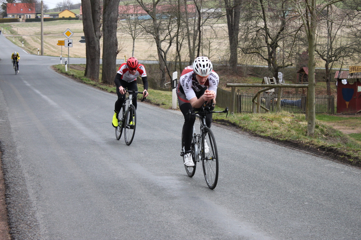Robert sprintete wie von der Tarantel gestochen los und setzte sich auf den ersten Metern deutlich ab. Dahinter versuchte ich mit Reini möglichst gleichmäßig hinterherzufahren. Im Laufe der Strecke konnten wir die Lücke kontinuierlich verringern. Auf den letzten Metern war die Ermüdung allen ins Gesicht gemeißelt. Leider ging ich etwas zu spät aus dem Sattel und verfehlte Robert auf der Ziellinie nur um eine halbe Sekunde. Ein hartes Rennen mit einem spannenden Zielspurt, was will man mehr!?